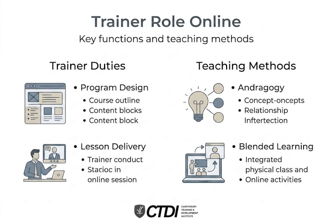 Trainers in online vocational education design industry-relevant programs, deliver engaging lessons via digital platforms, assess competencies, and ensure compliance with standards. That sentence packs in a lot. Let us break each responsibility down so you understand what a quality trainer is actually doing on your behalf.